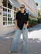 Este jean wide leg acampanado se destaca por su corte amplio y relajado, ofreciendo una silueta fluida, cómoda y moderna que brinda versatilidad al momento de vestir.